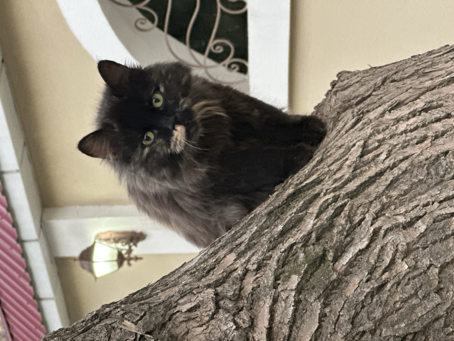 - "An outdoor scene in Tashkent, Uzbekistan, shows a long-haired domestic cat perched on a thick tree trunk" by FM-9wAJk1, licensed under CC BY 4.0