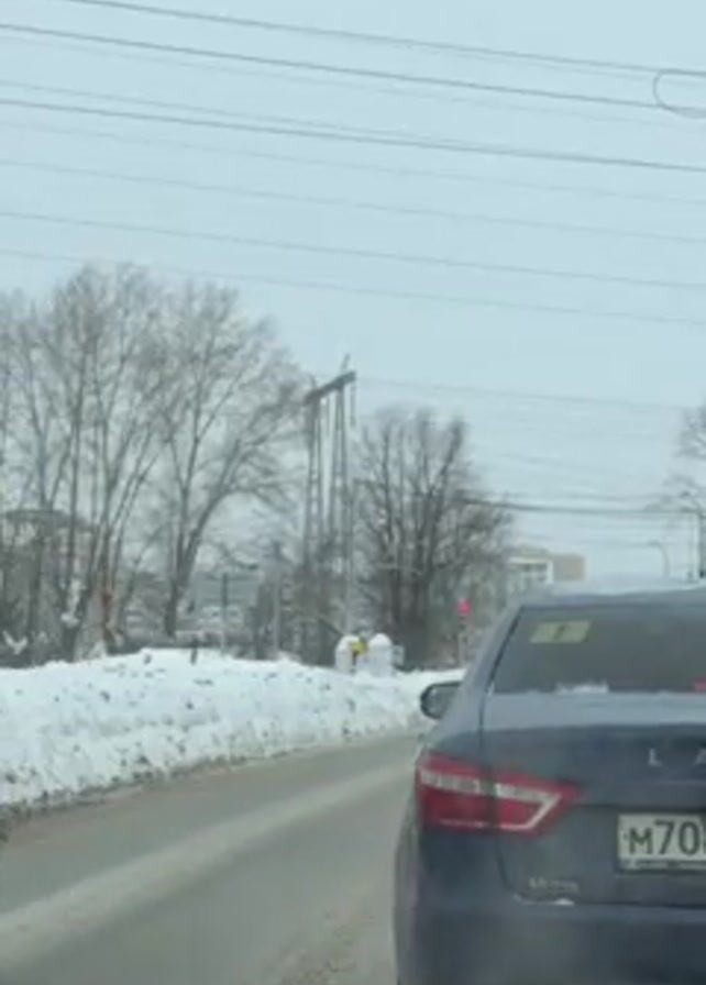 The view from inside a car shows a snowy, overcast day. A black Toyota RAV4 is to the left, and a dark blue Lada Vesta is to the right. Both cars are stopped at a traffic light, which is showing a red light in the distance. Bare trees line the side of the road, with piles of snow next to the road. Power lines run above the street.