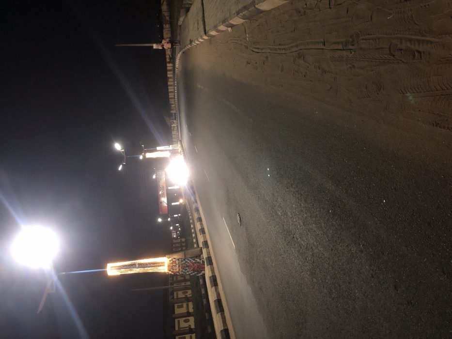 A night view depicts a roadway with streetlights illuminating the scene. The road is dark asphalt with tire tracks evident. Along the side, concrete barriers feature black and white stripes. Bright lights dominate the left, casting long beams. Buildings and signage line the road, with further lights visible in the distance, creating a sense of urban space at night.
