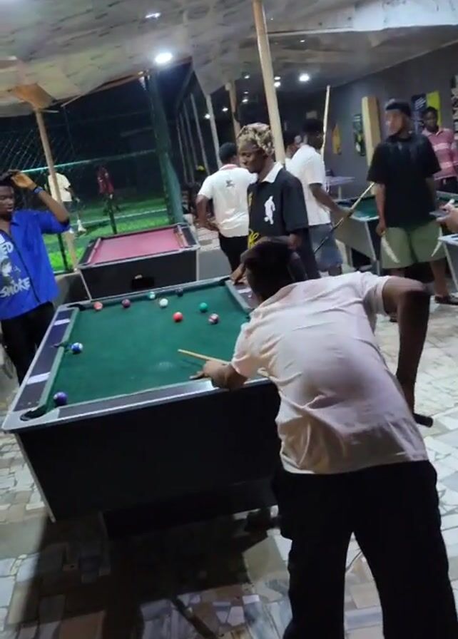 n indoor recreational space where several people are gathered around two billiard tables. The billiard tables are green and black. A man in a white t-shirt and black pants stands at one of the tables, lining up a shot. Other individuals stand around the table observing. One man is wearing a blue shirt with white lettering, while another wears a black shirt. There is a second pool table in the background, covered in red felt. There is a chain link fence separating the area from what appears to be a grassy field outside. The lighting in the room is bright, and the floor is tiled in a mosaic pattern. Several poles are present, propping up the roof.