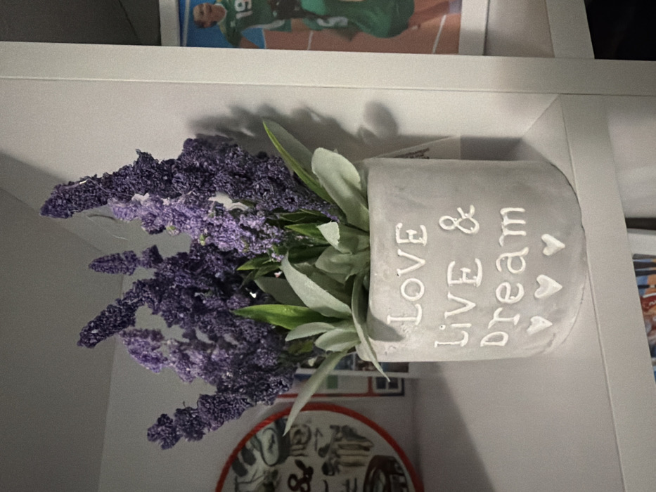 This image captures a decorative setup on a white shelf in Sofia, Bulgaria. The primary subject is a cylindrical, light gray pot holding artificial lavender plants. The pot features raised white text spelling "LOVE LIVE & Dream" followed by three small heart shapes. The artificial lavender consists of multiple stems with dense clusters of small purple florets and several light green, oval-shaped leaves. To the left of the pot, a portion of a circular object with a red rim and indistinct markings is visible. To the right, a white vertical shelf divider separates the potted plant from a framed photograph depicting two female athletes in green jerseys. The upper athlete wears number "19" and is smiling, while a second athlete wearing number "5" is partially visible below. The scene is illuminated by overhead or ambient light, casting soft shadows.
