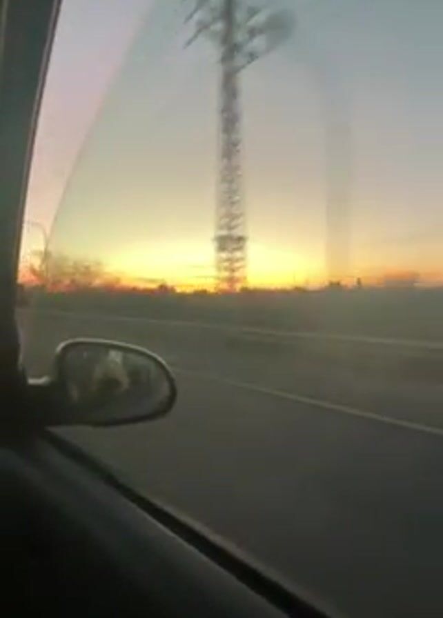 car driving on a road at sunset. The view is from inside the car, looking out the side window. The sunset is visible in the distance, with orange and yellow hues. Trees and utility poles are visible along the side of the road. The car is moving quickly, and the view is somewhat blurred. The car's side mirror is visible in the lower left corner of the frame.