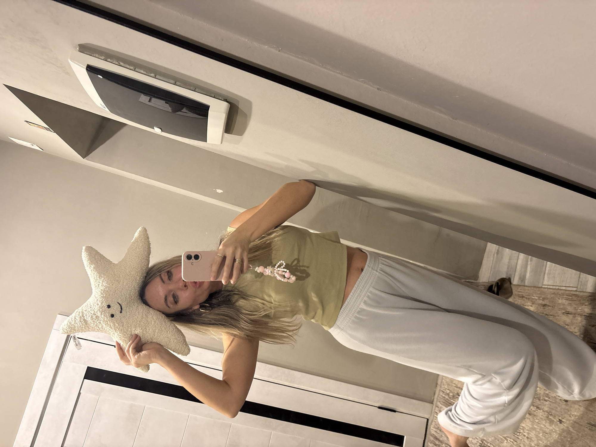 An indoor mirror selfie captures a light-skinned female individual in Votkinsk, Russia. She stands within what appears to be a modern residential or commercial interior, characterized by light grey walls, a white paneled door with dark vertical accents, and a tiled floor partially covered by a light-colored, patterned rug. To the right of the subject, a white and black electronic device is wall-mounted. The individual, with long blonde or light brown hair, is clad in a light olive-green sleeveless crop top and light grey sweatpants. She wears gold-toned hoop earrings and a ring on her left ring finger. She holds a light pink smartphone with dual rear cameras in her right hand, using it to photograph her reflection. Attached to the smartphone is a pink beaded strap or charm. Her lips are pursed, and her gaze is directed at the camera lens. With both hands, she holds a cream-colored, textured, star-shaped plush pillow, featuring a simple black embroidered smiley face, positioned above her head. Her left foot is slightly lifted, and her right arm is bent with the elbow resting against the wall.