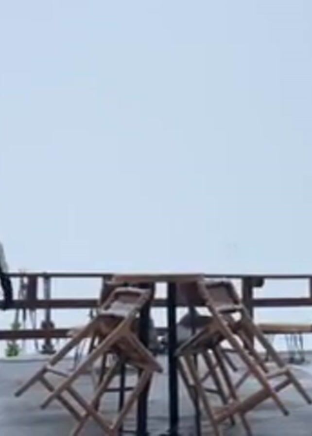 A person in ski gear is standing in front of a wooden sign that reads "CHALET ETOILE". It is snowing heavily. To the right of the person are several wooden tables and chairs, which are covered in snow. In the background, there is a railing and more snow-covered scenery. A pine tree is visible on the left. The person appears to be looking at their phone.