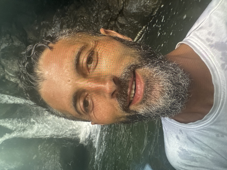 A male individual is captured in a close-up portrait, positioned in front of a natural waterfall and a body of water, located in the city of Gennevilliers, France. The man, appearing middle-aged, has short, wet, dark hair with visible graying and a full, wet, gray beard. He looks directly at the camera with a slight smile, his eyes dark brown. He wears a wet, white, short-sleeved t-shirt. The background consists of a cascading waterfall over dark rock formations, with a pool of water visible at the base and to the sides. The overall environment suggests a natural, outdoor setting.