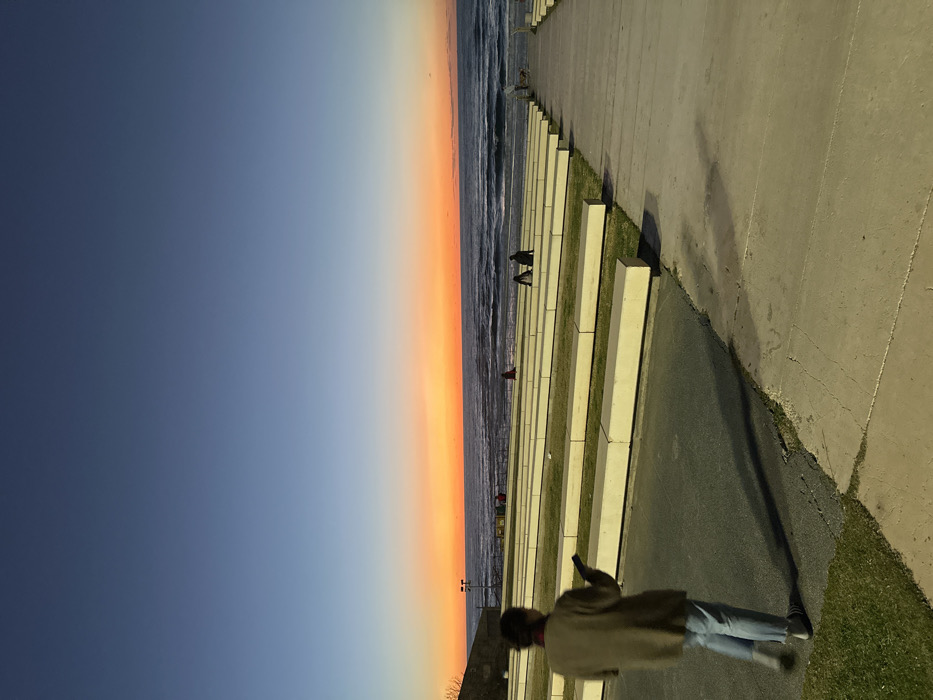 A long shot captures a sunset scene at a beach. The sky transitions from deep blue to bright orange. To the right, a concrete walkway with steps leads down to the beach. Several people are on the steps watching the sunset. A person in a jacket and jeans stands in the foreground, facing towards the horizon. The picture is taken at an angle.