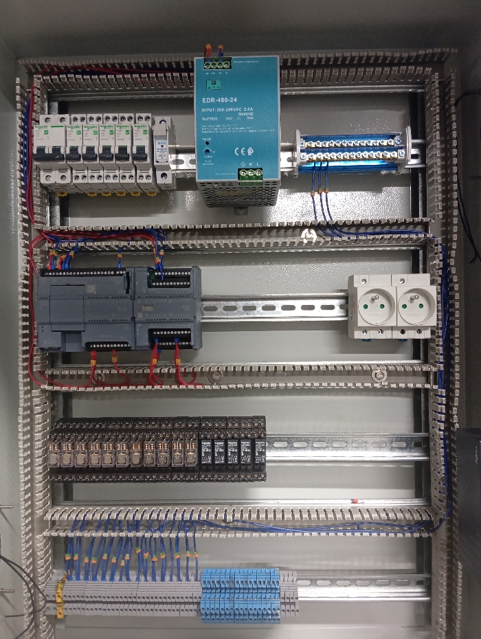 The image displays the interior of an open electrical control panel, located in Unknown, Unknown. The scene is a static depiction of industrial electrical and control components professionally mounted on DIN rails within a grey metal enclosure. From top to bottom: * **Top Left:** A row of five green-levered miniature circuit breakers (MCBs) is present, alongside one white surge protection device (SPD). * **Top Center-Right:** A turquoise-colored power supply unit, labeled "EDR-480-24" with input/output specifications, is mounted. To its right, a translucent blue terminal block glows faintly, indicating potential power or activity, with multiple blue wires connected. * **Mid-Left:** Two grey programmable logic controller (PLC) modules, resembling Siemens S7-1200 series units, are mounted. These modules are wired with red and blue cables leading to adjacent terminal blocks. * **Mid-Right:** Two white European-style (Schuko) electrical sockets with grey covers are mounted on a DIN rail. * **Lower Mid-Section:** A long series of approximately twenty-seven black industrial relays with clear covers are neatly arranged on a DIN rail. * **Bottom Section:** Multiple rows of grey and blue terminal blocks are visible, densely populated with numerous blue wires, each precisely terminated with ferrules. A yellow-green wire, indicative of a grounding conductor, is connected to a terminal block at the very bottom left. Red, blue, and some yellow-green wires are systematically routed through slotted wire ducts along the vertical sides of the panel, connecting various components. No individuals, actions, or interactions are present in the scene; it depicts a fully assembled and wired industrial control system.