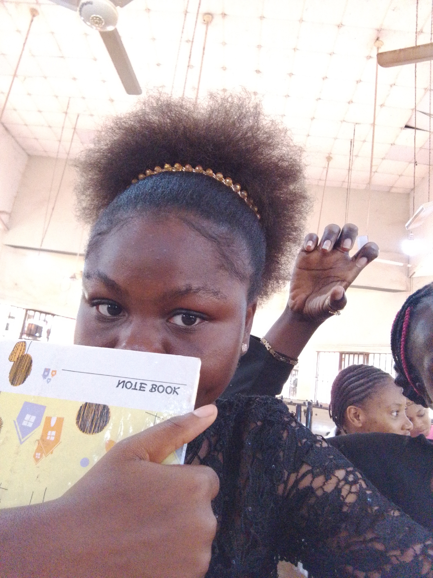 This image depicts an indoor scene, likely a classroom or lecture hall, in Nsukka, Nigeria. A young Black female is prominently featured in the foreground, looking directly at the camera. She has voluminous, dark, curly hair styled with a gold-beaded headband. Her lower face is partially obscured by a white notebook, held by her left hand, which displays the mirrored text "NOTE BOOK" and decorative house-shaped graphics on its yellow cover. Her right hand is raised and open, revealing a ring on her ring finger and light-colored manicured nails. She is wearing a dark top, possibly black lace, a gold-colored bracelet on her right wrist, and a stud earring in her left ear. In the background, another young Black female with braided hair is partially visible to the right, seated, alongside the partial view of a third individual. The ceiling features a grid pattern with multiple white ceiling fans and suspended light fixtures. The setting is consistent with an educational institution within Nsukka, Nigeria.