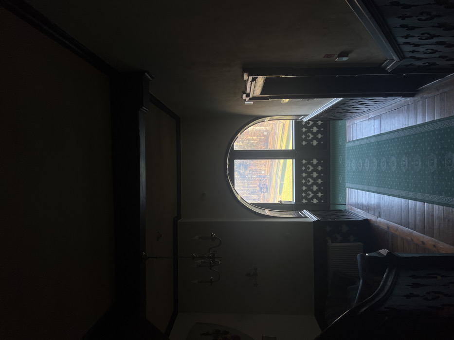 The image depicts a dimly lit interior hallway or landing within a building located in Kliczków, Poland. Natural light streams from a large, arched window at the far end of the hallway, illuminating an exterior scene. The interior features dark wooden floorboards, covered by a long, narrow green runner rug extending towards the window. Dark wooden banisters with carved, openwork patterns are visible on the left and right, indicating staircases. The lower portions of the walls are adorned with dark wooden paneling featuring a repeating pattern of stylized quatrefoils, while the upper walls are a lighter, neutral tone with dark trim. A dark, ornate metal chandelier with three arms hangs from the ceiling on the left side of the hall. Further left, a wall-mounted radiator is present, and a shield-shaped object with a dark design is partially visible on the wall. On the right, an open doorway with a dark, heavy wooden frame leads into an unseen, dark interior space. Through the arched window, a bright outdoor environment is visible under direct sunlight. This includes a grassy area, a dirt path, and a dense treeline composed of deciduous trees in autumn colors and some evergreens. A small, dark shelter or gazebo with a pointed roof is discernible in the middle distance of the exterior view. No individuals or animals are present in the scene.
