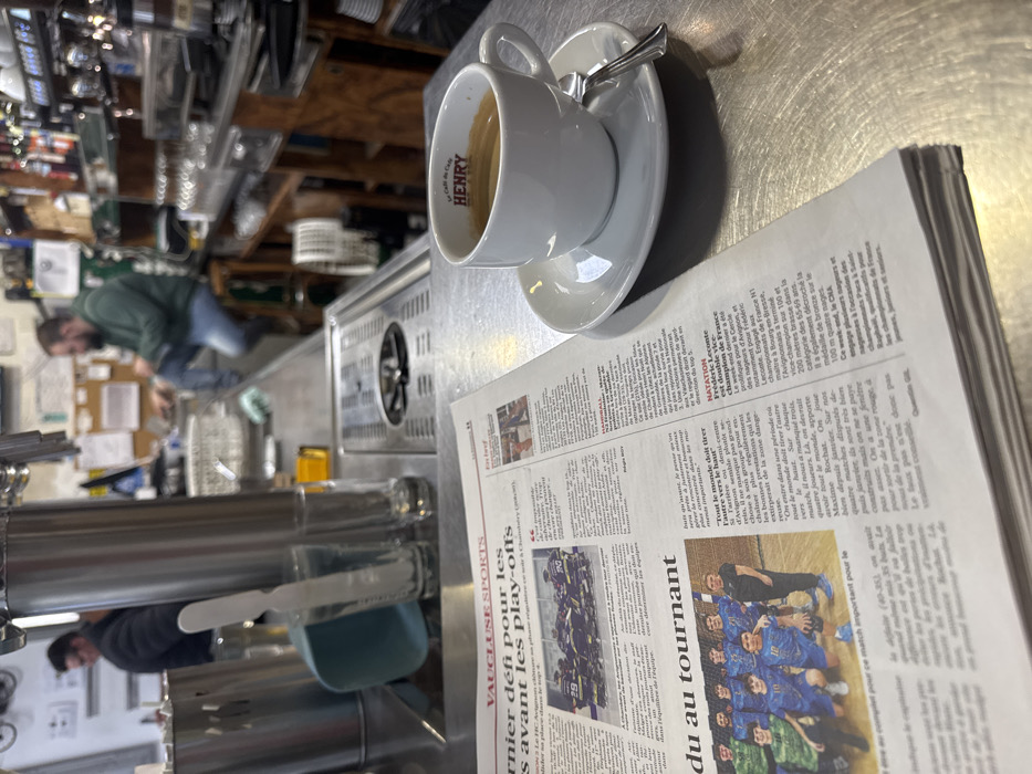 The image presents an interior scene within a café or bar in Cucuron, France, viewed from a counter-level perspective. In the immediate foreground, a folded French newspaper, titled "VAUCLUSE SPORTS," rests on a brushed metal counter. The visible newspaper sections include headlines and two embedded photographs: one depicting a group of ice hockey players and another showing a team of young soccer players. To the right of the newspaper, a white ceramic cup labeled "Le Café du Café HENRY" contains an espresso, resting on a matching white saucer with a small silver spoon. Behind these foreground elements, the metal counter features multiple stainless steel beverage dispenser taps, a clear glass holding a white stirrer, another empty clear glass, and a light blue container. An integrated stainless steel drip tray is visible within the counter surface. The midground and background, appearing slightly out of focus, reveal the establishment's bar area. On the left, a male individual in a dark jacket is partially visible behind the counter, indicative of a staff member. To the right, a bearded male patron, dressed in a green hooded top and blue jeans, is seated on a high stool at the bar. The wall behind the bar is lined with shelving displaying various bottles and glassware. A corkboard with papers pinned to it is visible on the far-left background wall. The scene is illuminated by ambient indoor lighting.