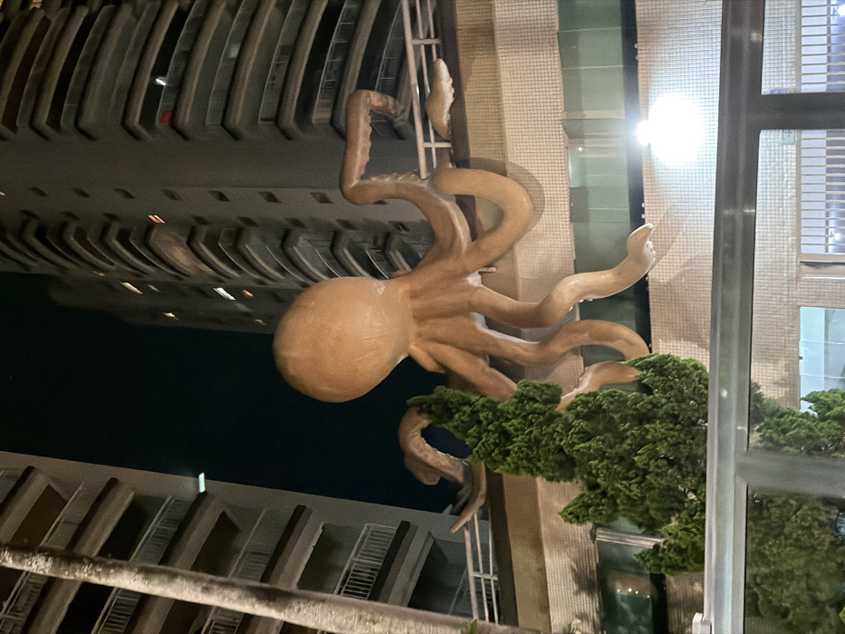 A large, tan octopus sculpture clings to the side of a building. The octopus has prominent tentacles and a smooth body. Lush green foliage surrounds the base of the sculpture. The background features a mix of architectural elements, including balconies and windows, reflecting ambient light. The scene appears to be captured at night, with dark skies visible in the spaces between buildings. The image has been rotated to the left.