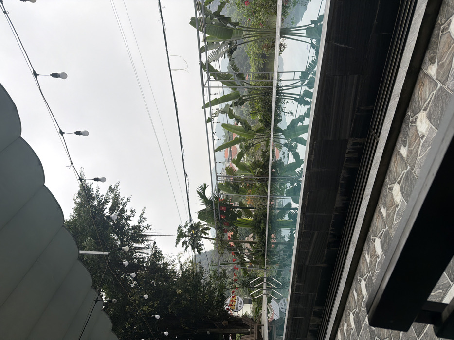 This image captures an outdoor leisure area in Nam Hoa Lư Ward, Vietnam, likely part of a resort or hotel property, under an overcast sky. In the immediate foreground, the top of a dark wooden bench is partially visible, extending from the bottom left towards the center. The ground beneath it is paved with patterned tiles in shades of grey, brown, and white. A long, rectangular swimming pool dominates the midground, featuring light blue water that reflects the surrounding vegetation and the sky. The pool has a dark-tiled edge and steps are visible at its left end. Beyond the pool, a lush array of tropical foliage is present, including large banana-like leaves, palm-like plants, and various shrubs, some supported by a metal framework. A large tree with hanging aerial roots stands on the far left, partially obscured by an overhead light-colored fabric canopy that extends into the upper left of the frame. String lights with exposed bulbs are strung across the scene, both beneath the canopy and extending horizontally across the open sky. In the background, rolling, verdant hills are visible, interspersed with buildings featuring red or orange tiled roofs. Utility lines traverse the upper midground against the pale, cloudy sky. No individuals are present in the scene.
