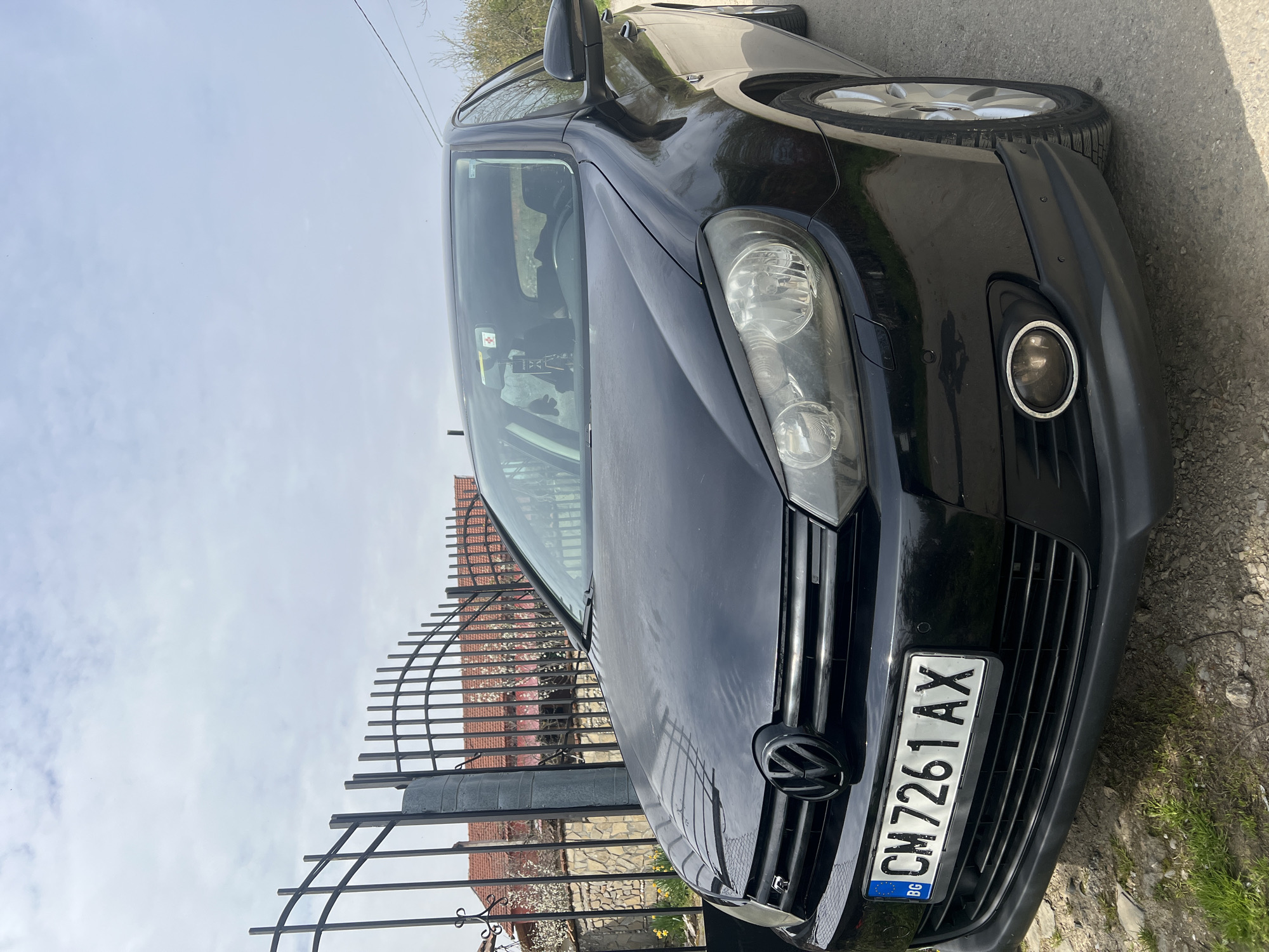 A black Volkswagen Golf, bearing the Bulgarian license plate CM7261AX, is parked in what appears to be a residential area of Shumata, Bulgaria. The front of the car is positioned towards the camera, showcasing its headlights, grill, and the Bulgarian license plate. The car is parked next to a low metal fence, with a building visible behind it. The sky is overcast. The ground adjacent to the car is a mix of concrete and grass.