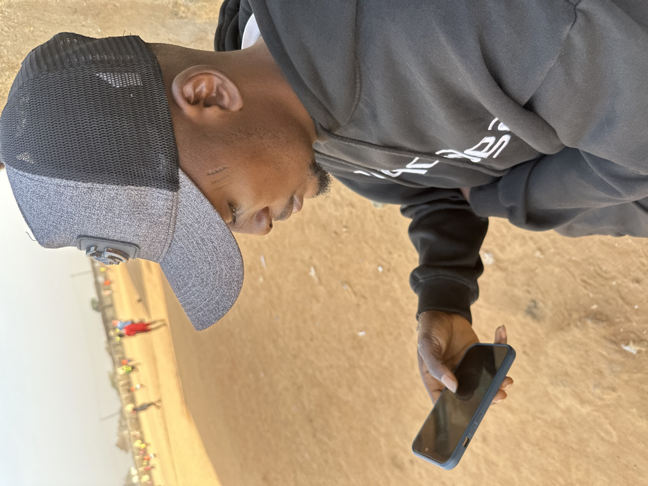 A man wearing a grey and black trucker hat and a grey hoodie holds a smartphone. He stands on a sandy surface. In the background, blurry figures and structures suggest an event or gathering is taking place. The image is rotated, positioning the man almost horizontally. The focus is on the man and his phone, with the background elements appearing less distinct.