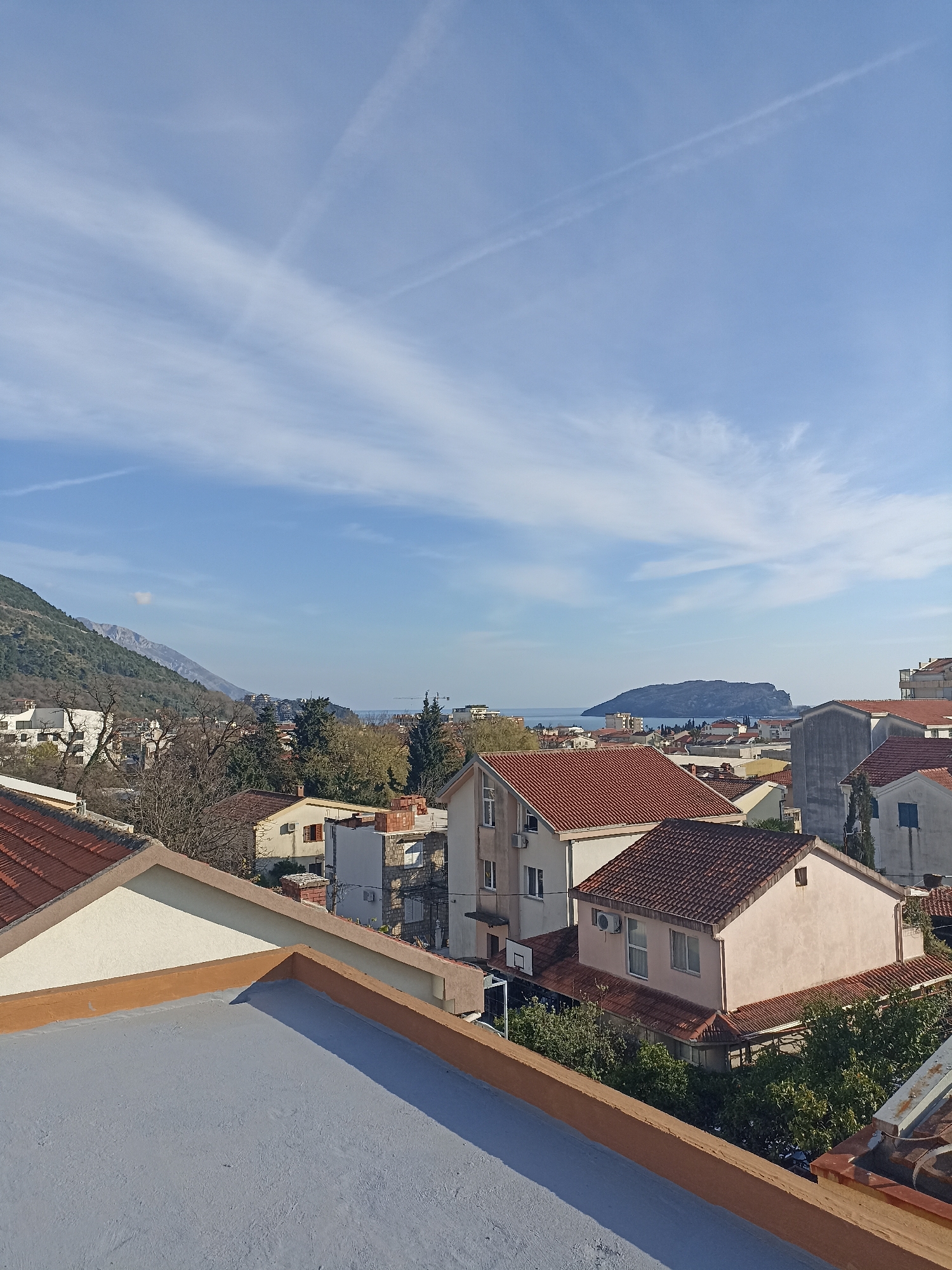 This image depicts a daytime panoramic view of a residential area in Budva, Montenegro, observed from a raised vantage point, likely a rooftop. The sky is light blue, featuring several diffuse white cirrus clouds and multiple linear contrails, with one prominent contrail forming a diagonal line across the upper right quadrant. In the immediate foreground, a flat, light grey rooftop surface is visible, bordered by a low, orange-brown parapet wall. To the left of this parapet, the cream-colored gable end of a building with a sloped red-tiled roof is present. The midground is dominated by numerous residential buildings, characterized by light-colored stucco facades and traditional red-tiled roofs. Specific details on these buildings include multiple windows, external air conditioning units, and visible chimney stacks. A white basketball hoop with a net is discernible attached to a structure behind a building toward the center-right. Various trees, some appearing deciduous with bare branches and others evergreen with dense green foliage, are interspersed among the buildings. In the background, a large, green, forested mountain range rises sharply on the left. Towards the center-right, a section of the Adriatic Sea is visible, extending to the horizon. A prominent, dark, elongated landmass, identified as the island of Sveti Nikola, is clearly visible in the sea. The scene is illuminated by bright sunlight, casting visible shadows. No individuals are present, and no active interactions or specific events are depicted.
