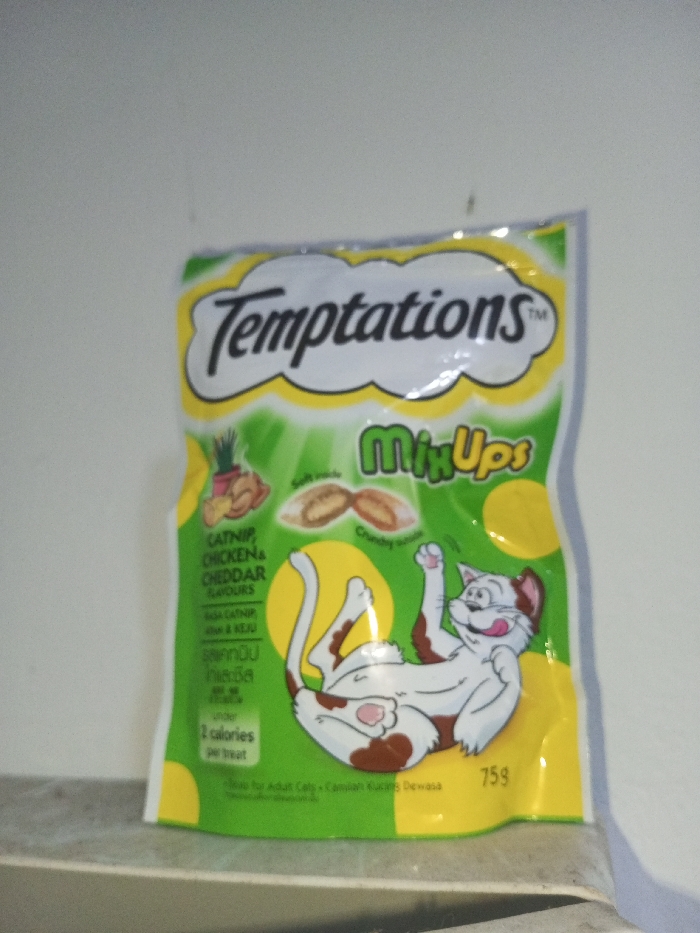 - "bag of Temptations MixUps cat treats with catnip, chicken, and cheddar flavors" by FM-JzEnU2, licensed under CC BY 4.0