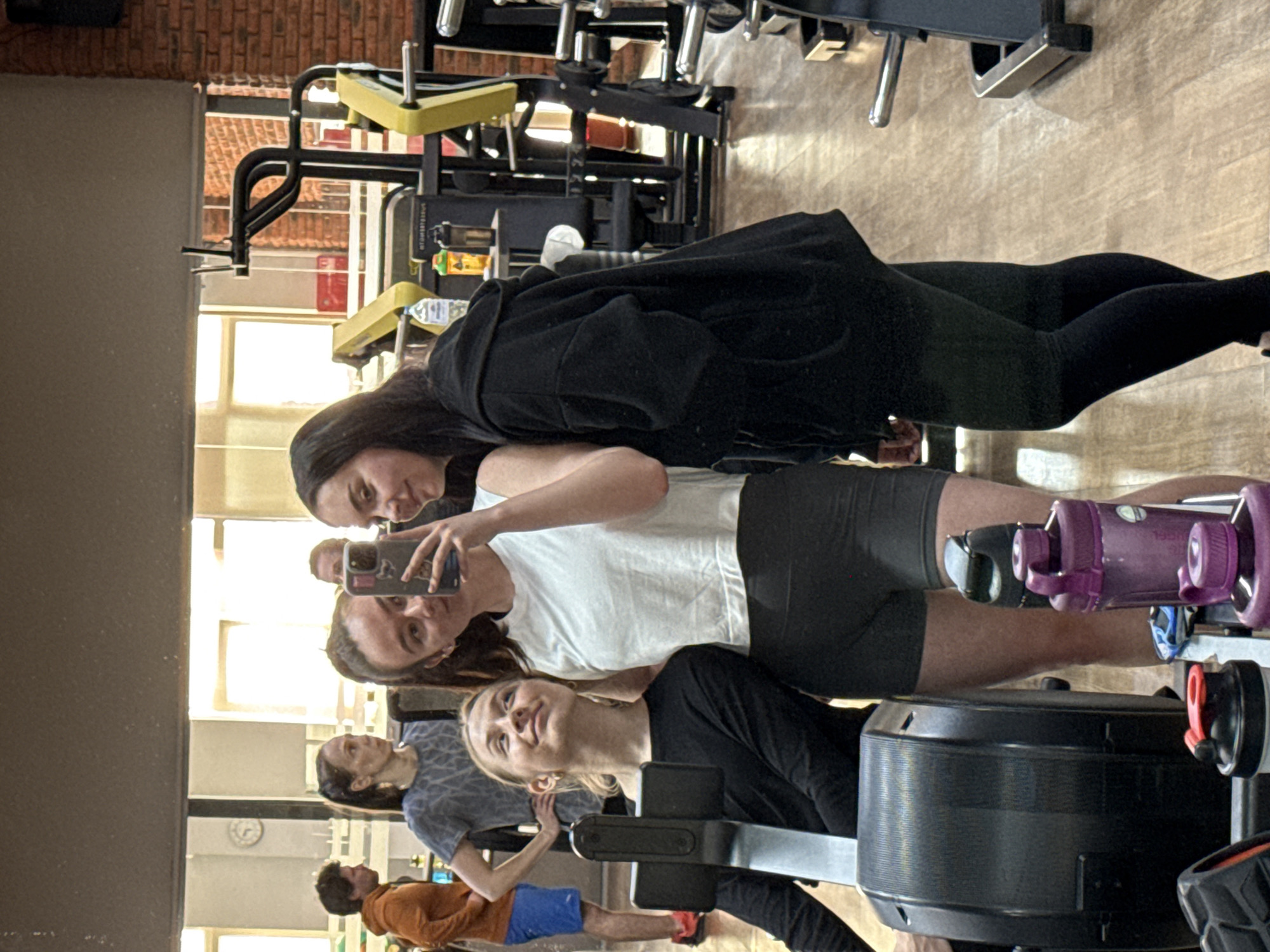 mirrored scene in a gym setting in Chaikovsky, Russia. Four women are visible, with three appearing to take a selfie in front of a mirror. The first woman wears a black long-sleeved shirt, the second a white t-shirt and black shorts, and the third a black hooded sweatshirt and black leggings. The fourth woman is wearing a short-sleeve, grey and blue camouflage-patterned shirt. Behind the women in the mirror, a man in a brown long-sleeve shirt and blue shorts is partially visible, along with another person partially obscured behind the fourth woman. Gym equipment is visible in the background, including weight machines. The gym has a brick wall. A water bottle is on the right.