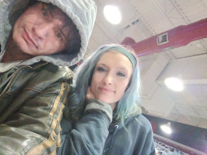 A close-up image depicts two individuals, one male and one female, positioned facing forward, likely a selfie. The male, on the left, wears a light gray hooded sweatshirt over his head, partially obscuring dark hair, and a dark, possibly leather, jacket featuring two horizontal light brown stripes on the upper left arm. He exhibits a slight smile. The female, on the right, has light blue hair with a matching headband and wears a dark gray hooded sweatshirt; her right hand rests near her chin. She has a nose piercing on her left nostril and also displays a slight smile. The background reveals an indoor environment with a white grid ceiling, exposed metal structures, and bright circular light fixtures. A prominent, oversized red cylindrical object, resembling a large beer bottle with a rectangular white label, is suspended horizontally from the ceiling in the upper right. A dark, possibly tiled or textured wall section is visible in the lower right background. The scene is located within a commercial establishment in Ozark, United States.