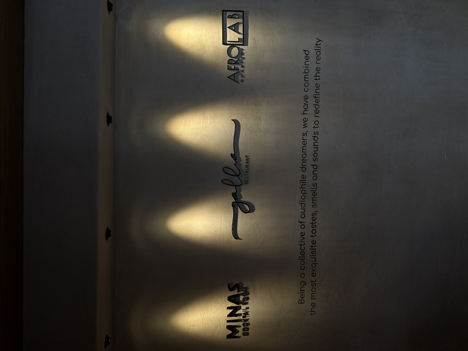 The image displays an interior gray, textured wall illuminated by four recessed warm spotlights from the ceiling. Three distinct black logos are mounted horizontally across the upper portion of the wall: "MINAS COCKTAIL ROOM" is on the left, "gallia RESTAURANT" is in the center, and "AFROLAB ROASTERY" is on the right. Below these logos, a single line of dark text reads: "Being a collective of audiophile dreamers, we have combined the most exquisite tastes, smells and sounds to redefine the reality". The scene is static, devoid of people or discernible activity. This establishment is located at 1/1 Arami Street, Yerevan, Armenia.
