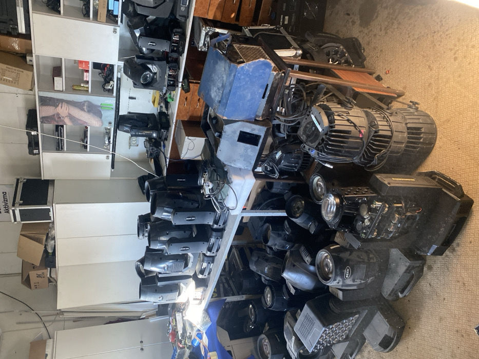 The scene depicts an interior room in Mojanovići, Montenegro, serving as a storage or workshop area for professional stage lighting equipment