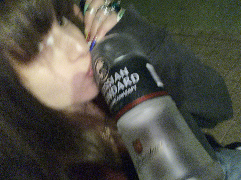 A person's face is close to a bottle of Russian Standard vodka. The person has rings on their fingers and multi-colored nail polish. A grey garment is behind the bottle. The surface in the background appears to be concrete. The image is blurry.