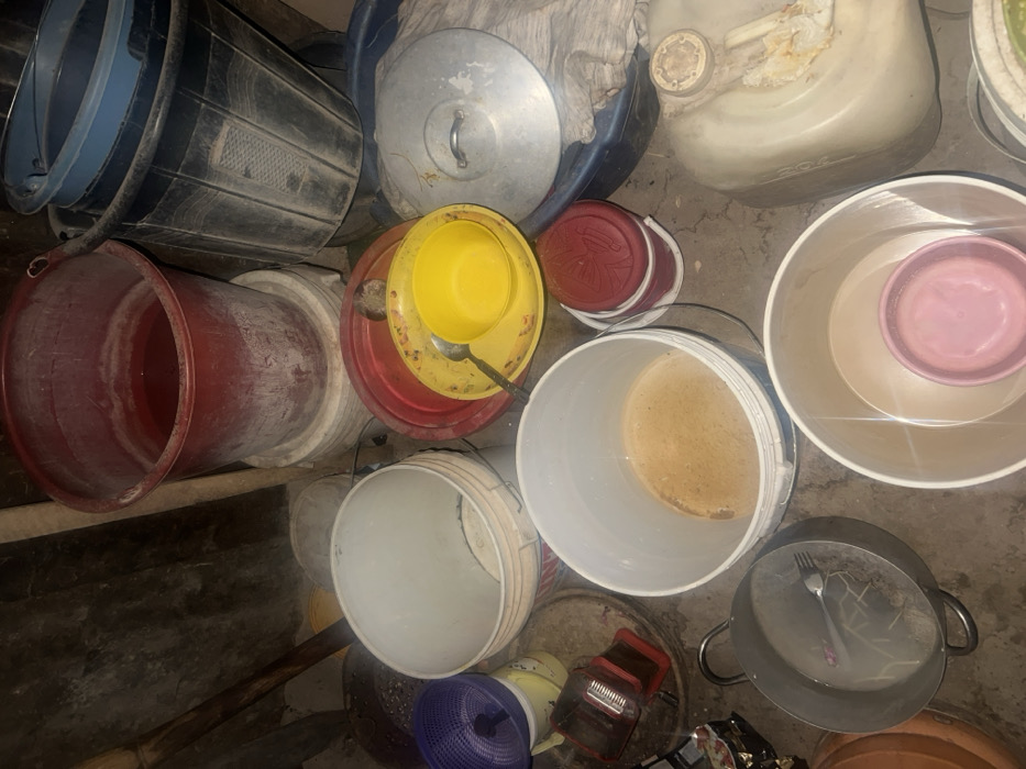 A collection of buckets and kitchenware clutter the scene