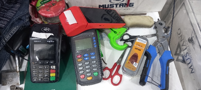 cluttered tabletop with various objects. There are two point-of-sale (POS) terminals, one red and one black, along with a gray calculator-like device. Tools include scissors (red and black), a hole punch with blue handles, and a green plastic tool. A tin box with brown polish, a jar of preserved tomatoes, a padlock with keys, and a Mustang-branded box are also visible. A sponge and denim fabric add to the disarray.