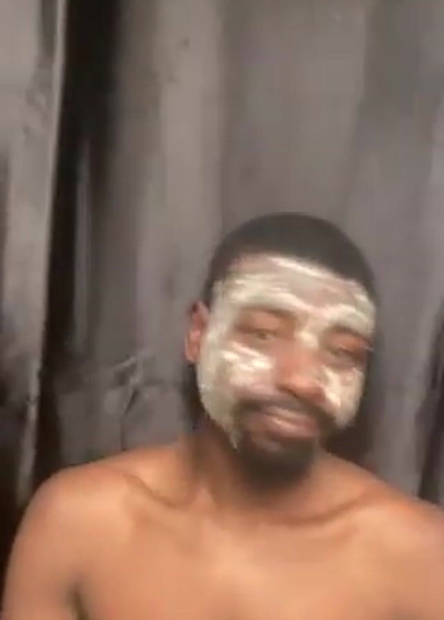 A shirtless Black man with a beard applies a white face mask, using his hand to rub it onto his face