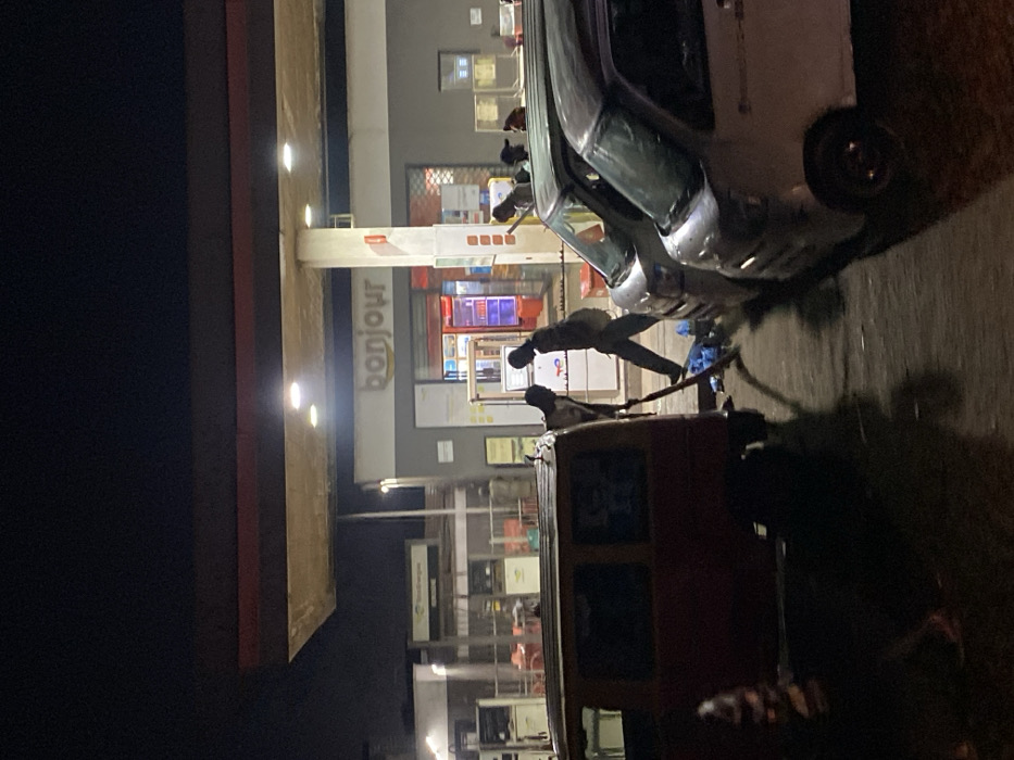 A brightly lit gas station at night. Above the pumps, the sign reads "bonjour". Several cars are parked in front of the gas station, and it appears that people are putting gas in their vehicles. The scene is captured at an angle, with the foreground being dark and a bit blurry.