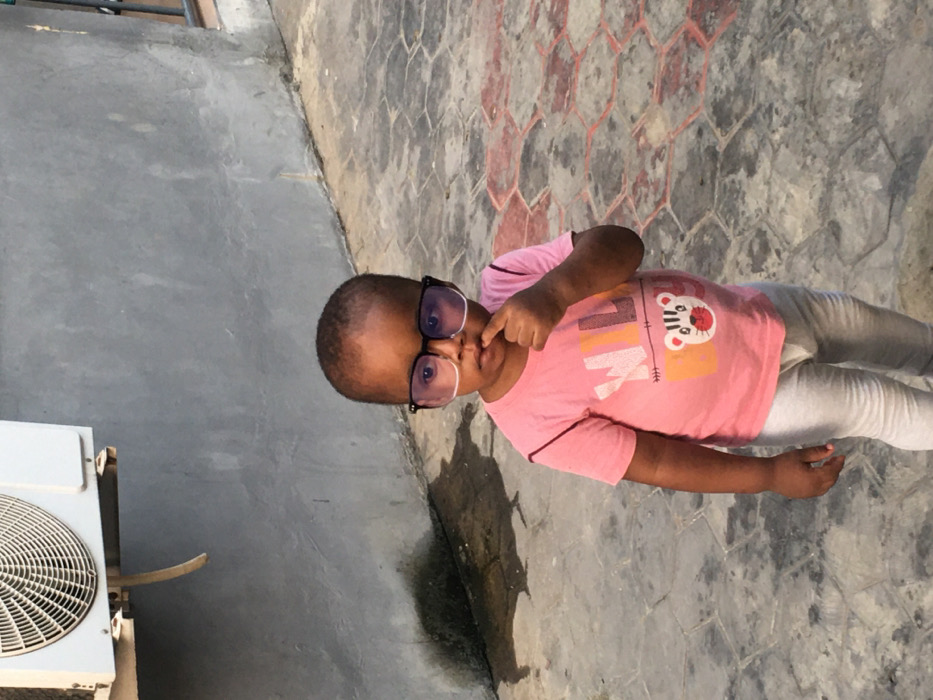 A small child with dark skin and a shaved head wears glasses and a pink t-shirt with a cartoon tiger. They stand on a patterned concrete surface next to a gray concrete wall. An air conditioning unit is visible on the left side. The child is touching their nose with their right hand.