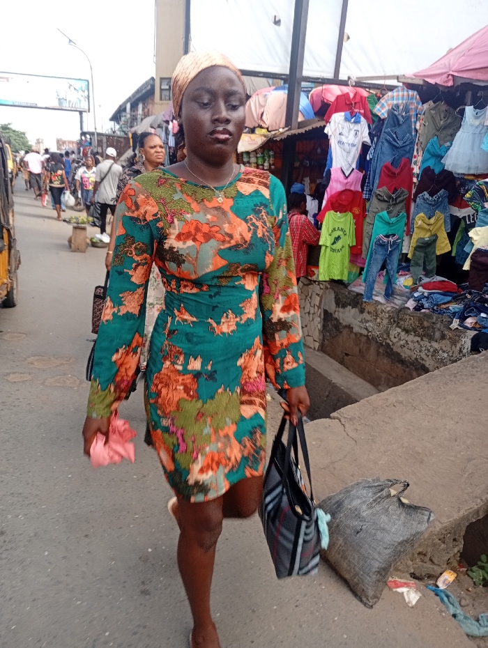 The image depicts a busy street scene within a market area in Onitsha, Nigeria. The central figure is a dark-skinned female, appearing to be in her mid-20s to early 30s, walking forward and slightly to the viewer's left. She wears a long-sleeved, short-length dress with a prominent teal green, orange, and brown floral or abstract pattern, and a light tan or beige headscarf. Her left hand holds a crumpled pink cloth, and her right hand carries a grey and black striped tote bag with a light blue tassel. She is wearing light-colored flat shoes. To her left, in the background, a street extends with numerous pedestrians, a yellow vehicle partially visible, and a large billboard displaying "TANTALIZERS" text. To her right, a series of market stalls line the street, displaying a dense array of used clothing items for sale, including shirts, t-shirts (one prominent green shirt reads "KAKANGI EBIAYA"), dresses, and jeans, hung from racks and piled on surfaces. A concrete curb and drainage structure run along the right side of the street. The scene is illuminated by natural daylight, indicating an outdoor, active commercial environment.
