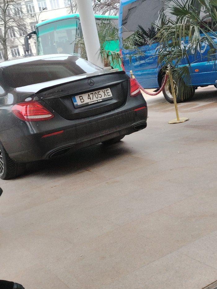 The scene depicts an outdoor urban environment, specified as being in Silistra, Bulgaria. A dark grey Mercedes-Benz sedan, bearing Bulgarian license plate B 4705 XE, is centrally positioned, viewed from its rear-left quarter. The vehicle features dark tinted rear windows, a trunk lid spoiler, and dual exhaust outlets. The license plate frame indicates "Champion Auto." The ground consists of light-colored rectangular paving tiles. In the mid-ground, a gold stanchion with a red velvet rope forms a barrier. Behind this barrier and partially obscured by large potted palm plants, a blue van or minibus is visible. Further in the background, to the left of a large white cylindrical pillar, a multi-story building with numerous windows and bare trees are present. A green bus is also partially visible behind the pillar and the Mercedes. No individuals are visible, and all vehicles appear stationary.