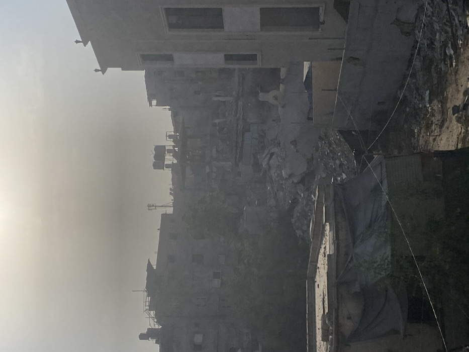 The image depicts a severely damaged urban landscape within Khan Yunis, Palestinian Territory, under a bright, hazy sky