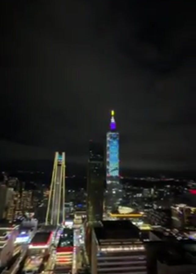 cityscape at night. There are several tall buildings visible, including one with a brightly lit spire and colorful lighting displays on its facade. The city lights stretch out into the distance under a cloudy sky. The camera pans slowly across the scene, showcasing the urban landscape.