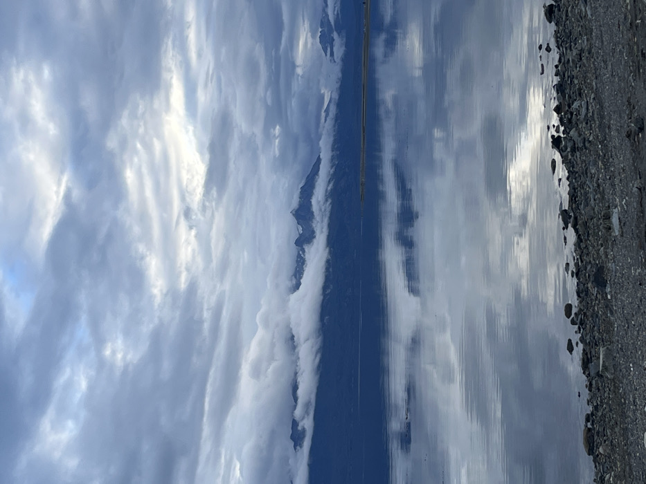 A panoramic landscape photograph depicts a tranquil natural scene in Ushuaia, Argentina. The upper two-thirds of the image display a sky densely covered by layered grey and white clouds, with brighter areas indicating obscured sunlight. Below the cloud line, a dark mountain range spans the horizon, with its peaks partially enveloped by thick, low-hanging white clouds. The calm body of water in the foreground and mid-ground precisely mirrors the sky's cloud patterns and the lower mountainous terrain. A narrow, rocky shoreline composed of dark grey pebbles occupies the immediate foreground. The scene is devoid of human presence, structures, or discernible action.