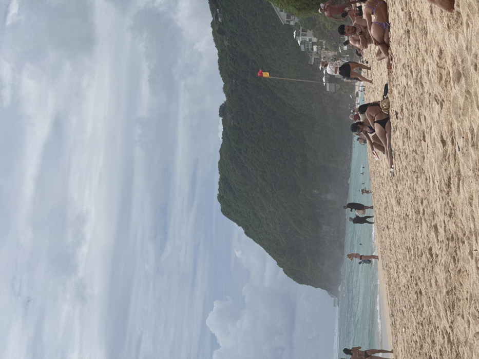 A beach scene with a dramatic backdrop of a tree-covered mountain. People are enjoying the beach, some sunbathing on the sand, others wading in the water. A lifeguard flag is visible. The sky is partly cloudy, creating a sense of diffused light over the landscape. The image captures a relaxed beach atmosphere with natural elements.