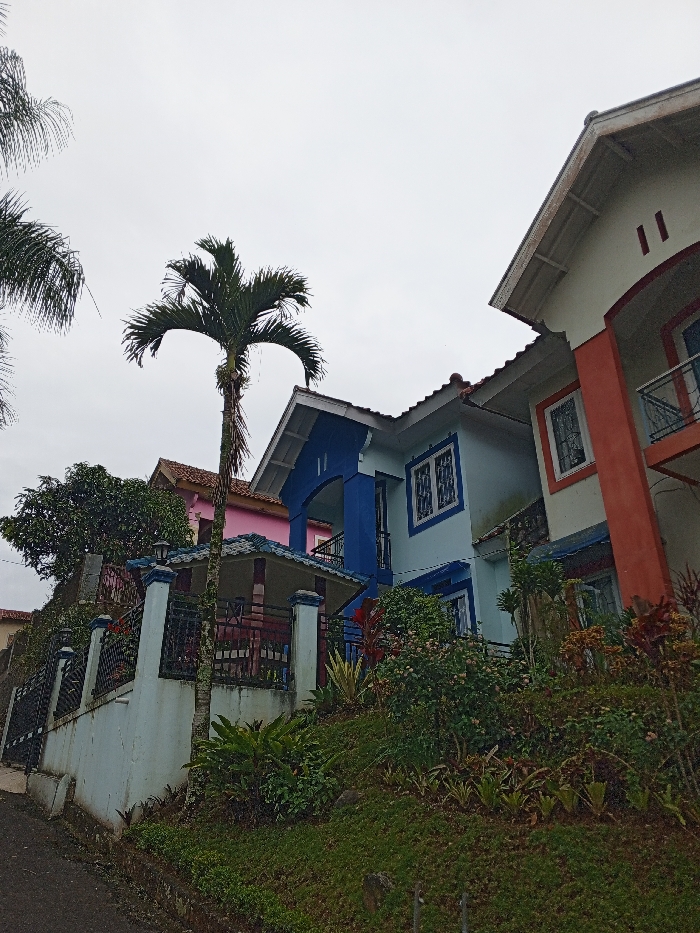The image showcases a row of colorful houses nestled on a hillside against a cloudy sky. The houses are painted in shades of pink, blue, light blue, white, and orange. A palm tree stands tall in front of one house. Lush green vegetation covers the slope below the houses, adding a natural element to the scene. A gray road leads up to the houses.