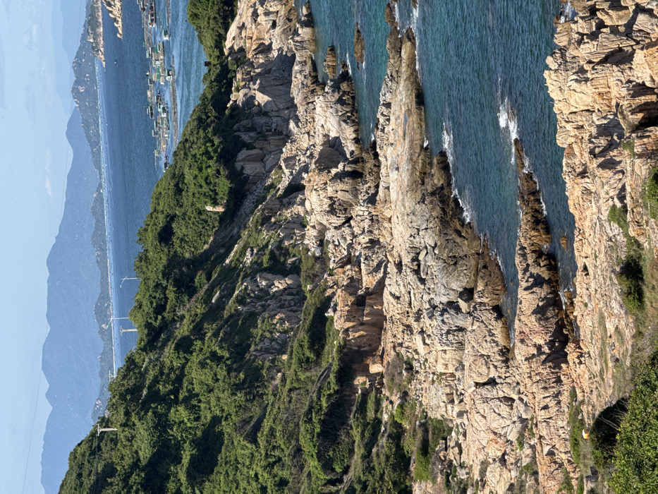Rugged coastal terrain meets the sea in this landscape. Steep, rocky cliffs with layers of stone and scattered vegetation dominate the right side. To the left, lush green slopes descend toward the water, where a line of utility poles is visible. Mountains fade into the horizon in the distance under a blue sky, completing the scenic view.