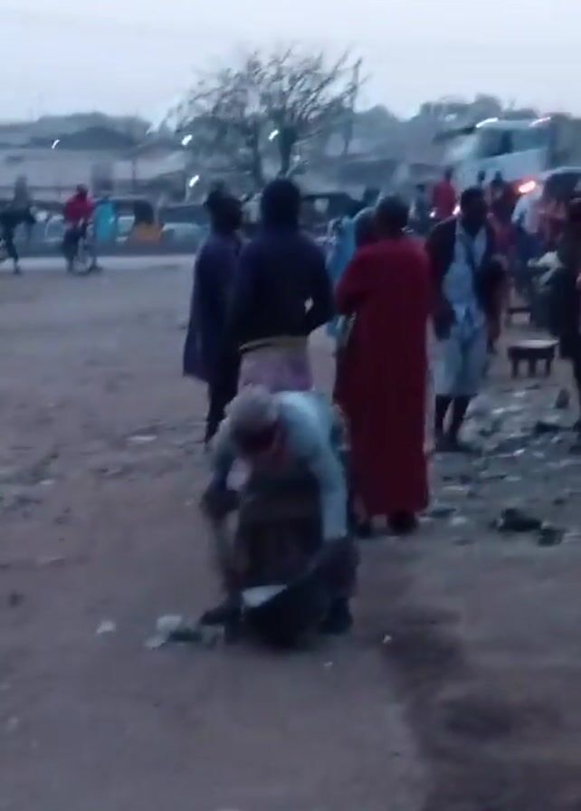 woman hunched over on a dirt road, using a broom to sweep debris into a black bucket. She is wearing a light-colored top, a patterned skirt, and a face mask. Several people stand nearby, watching her. In the background, there is a mix of vehicles, including an auto-rickshaw and a large truck with the letters "MSC" visible on it. The setting appears to be a busy outdoor area with a slightly overcast sky.