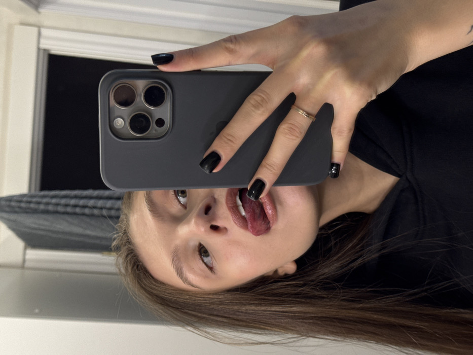 A young female subject is depicted in a close-up selfie taken via a mirror reflection, located in the city of Balashikha, Russia. Her face is positioned slightly angled, with long, straight brown hair partially visible on her left side. She wears a black hooded sweatshirt. Her left eye is wide open and visible, looking upward and to the viewer's left. Her mouth is open, with her tongue extended and touching her upper lip, which is adorned with light brown or nude lipstick. Her right hand, with fingernails painted black, holds a dark gray smartphone, obscuring the right side of her face and her right eye. The smartphone features a triple-lens camera module on its rear and is housed in a dark gray protective case. A thin, gold-colored ring is present on her right ring finger. Her right pinky fingernail features a small, reflective decorative element. The background, reflected in the mirror, shows a dark, vertically textured object (possibly a towel or curtain) on the left, and a dark, rectangular area (possibly a window or open doorway) above a white trim on the right. The lighting is consistent with an indoor setting.