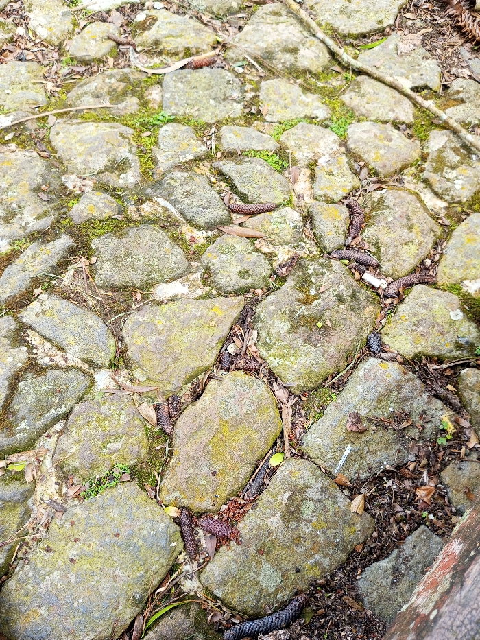 An overhead shot reveals a paved ground covered with irregularly shaped stones, many with patches of moss