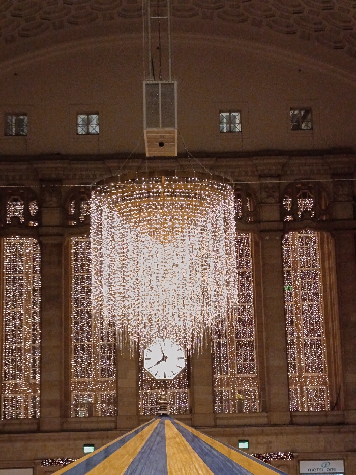 A grand interior showcases a massive chandelier of cascading lights hanging above a clock. Arched windows adorned with similar light strands form a backdrop. A blue and yellow striped tent structure is situated below, with a "Motel One" sign visible in the corner. Square windows punctuate the upper portion of the wall, under an ornate ceiling. A maintenance lift hangs above the chandelier.