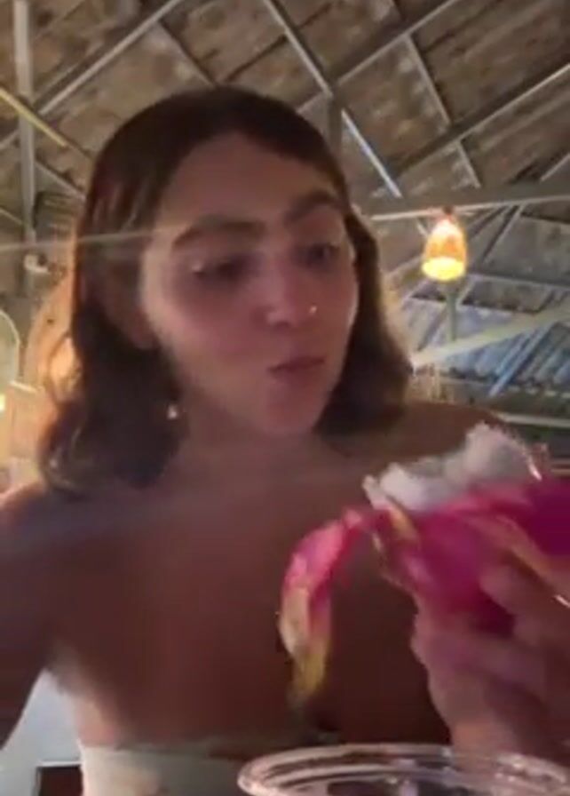 A woman is sitting and eating dragon fruit. She's wearing a strapless patterned top and a necklace. There is a plastic cup with a drink in front of her. The setting appears to be an outdoor seating area with a corrugated metal roof overhead. Someone's hand reaches into the frame, partially obstructing the view of the woman.