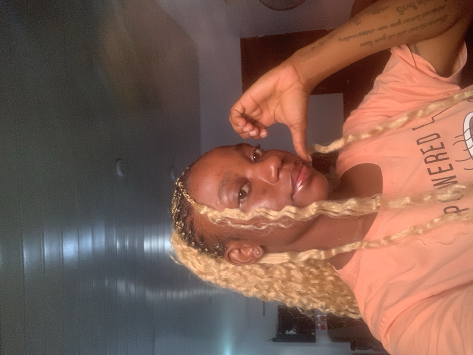 A female individual is photographed indoors in Ogombo, Nigeria. The subject, of apparent African descent, has dark skin, glossy lips, and dark roots with long, blonde, curly hair extensions styled in a high ponytail. Some individual braids are visible near her hairline, and lighter strands frame her face. She wears a peach-colored, short-sleeved t-shirt with a graphic print displaying "POWERED L" and part of another design. Her right hand is raised, with her thumb and index finger forming a partial heart gesture near her chin. Script tattoos are visible on her right forearm. She has a small stud in her left earlobe and is looking directly at the camera. The background is out of focus, revealing a dark ceiling with horizontal paneling. A blurred, circular object, possibly a fan, is partially visible on the right, and an indistinct object, possibly furniture or electronics, is on the left. The room is dimly lit.