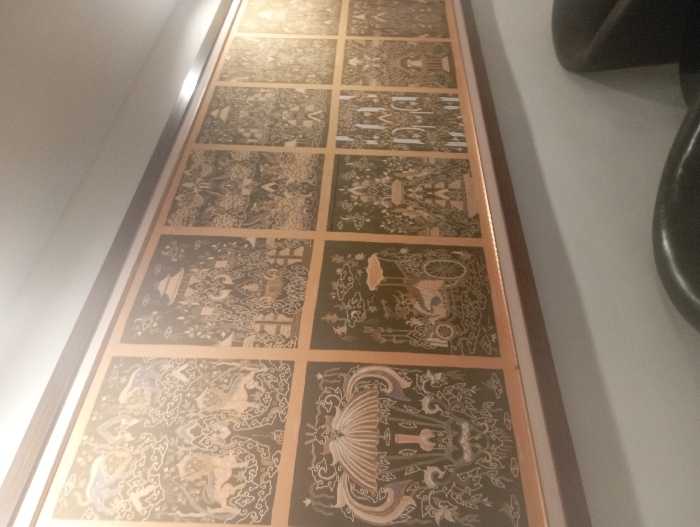 A rectangular artwork composed of twelve individual squares within a wooden frame. Each square features intricate, ornate designs in a contrasting color, possibly copper or gold, against a darker background. The designs vary across the squares, some appearing to depict scenes with figures and objects, while others showcase stylized patterns. The artwork is mounted on a wall, and part of a dark, undefined object can be seen to the right.