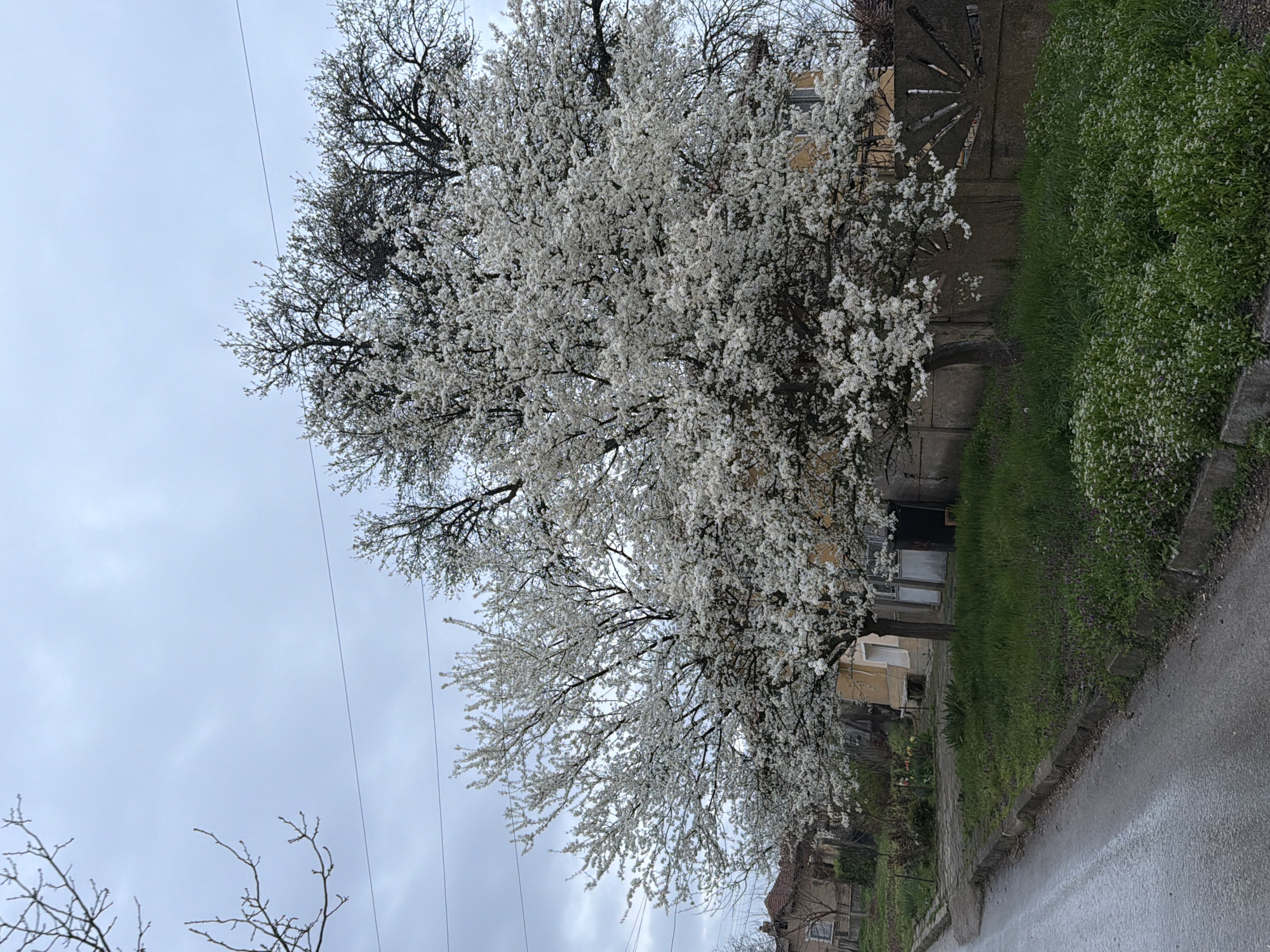 The image depicts a street scene in Dolni Dabnik, Bulgaria, likely in spring. The sky is overcast. A large tree with abundant white blossoms dominates the right side of the frame, partially obscuring a building. To the left of the blossoming tree, a bare tree is also visible. A fence runs along the property line, partially covered with vegetation. The street is paved and appears wet, suggesting recent rainfall. Buildings and residential structures are visible in the background. Power lines are overhead.