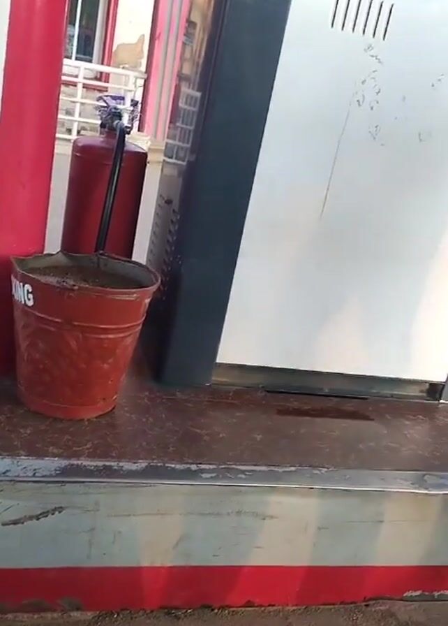 The camera pans up along a gas pump at a gas station
