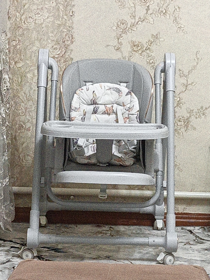- "An empty, grey, foldable baby high chair is positioned centrally within an indoor residential setting in Fergana City, Uzbekistan" by FM-KGeYB3, licensed under CC BY 4.0