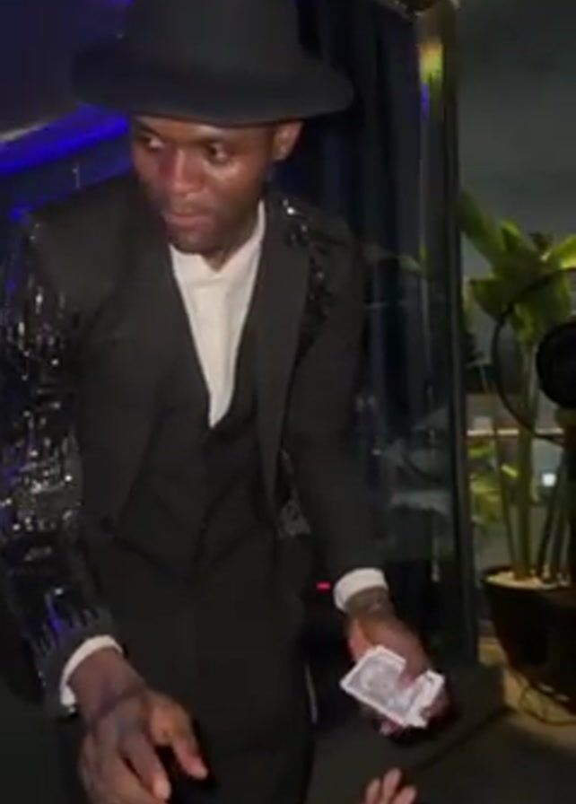 A man in a black fedora, suit vest, black jacket with a sequined right sleeve, and white shirt is performing a magic trick