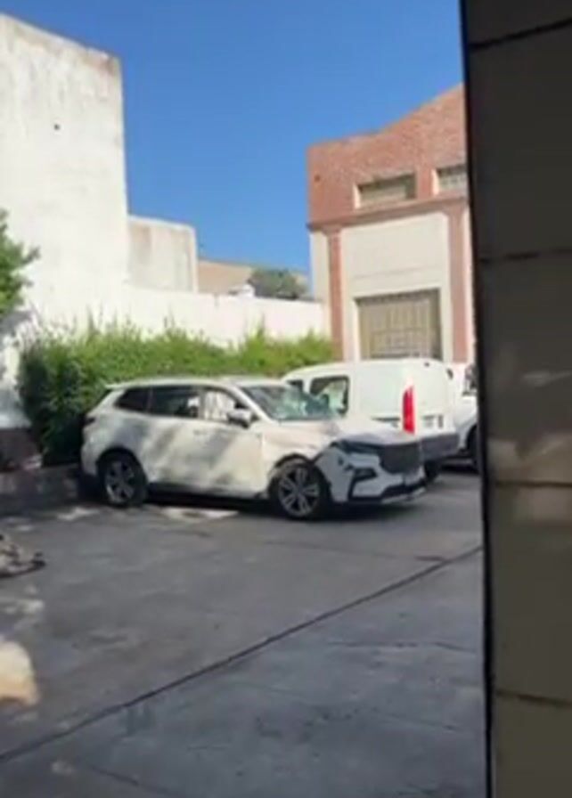 white SUV with front-end damage parked in a lot. The car's driver's side front is heavily damaged, with the fender and bumper smashed. The car is parked on concrete in front of a row of bushes. Behind the SUV is a white van and a tall brick building with white trim. A white wall and a partial view of a building frame the left side of the shot. The sky is blue and clear. The video appears to be taken from inside a building, looking out through a partially open door. The camera shifts slightly throughout the video.